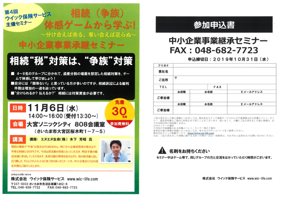 ◆内容・・・相続の場面で"平等"は残念ながらありません。特に中小企業経営者の場合は不平等な相続になりがちです。今回は部活動の部長となっていただき、特別予算の編成会議に参加していただきます。各部活動の事情を抱えながら、他の部活動と話し合う難しさ、タイムマネジメントなど気づきの多いセミナーです。中小企業ならではの資金対策もご紹介いたします。