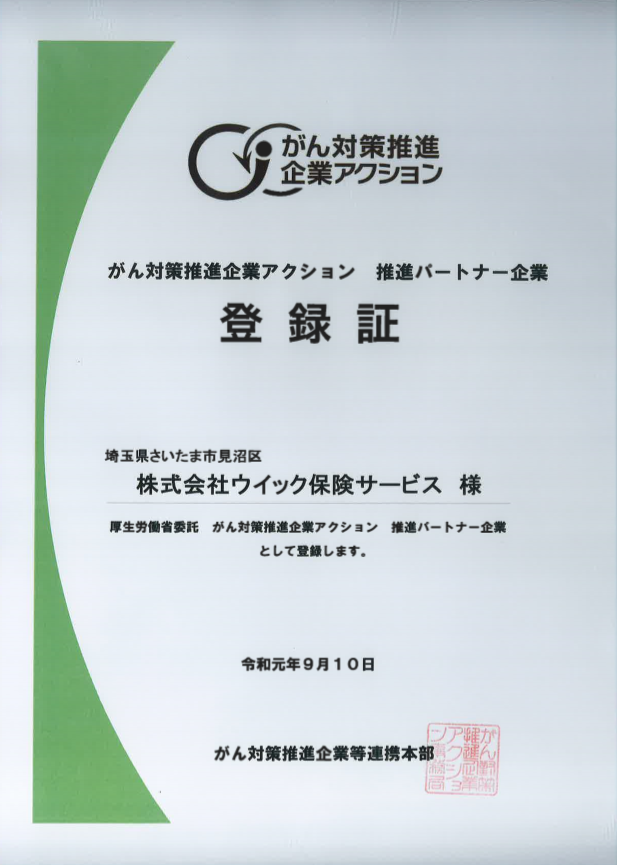 当社は、令和元年9月10日付で「がん対策推進企業アクション」推進パートナー企業に登録されました。